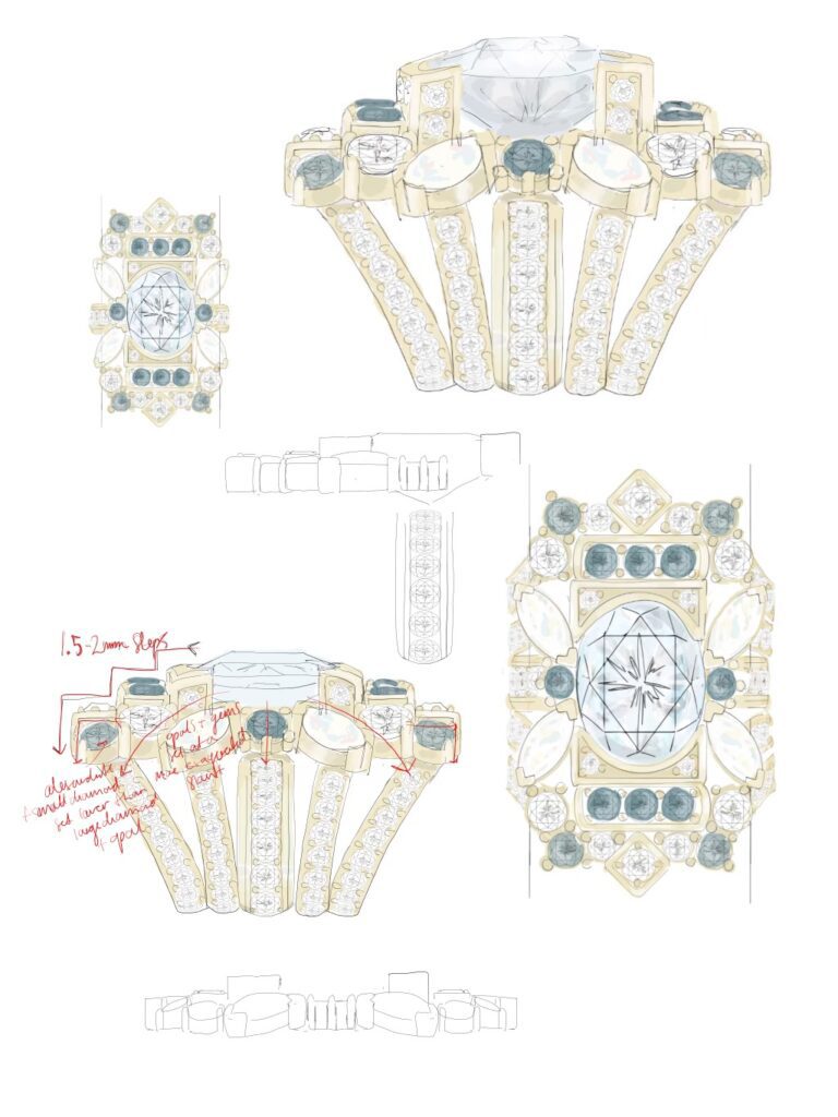 Em found us online and booked a design appointment. While Em did send us inspirational photos to guide our designs, not everyone has photos. Whether my clients have a few good inspiration photos of jewelry styles they like or not, what matters most in this design process is that clients make their design loves known, whether it’s through inspiration imagery of rings, rugs, mosaic tiles, graining in wood, flowers, etc. Clients often just tell us what they like, ie “I like green emeralds and teal sapphires, and I want a cluster ring in yellow gold”.