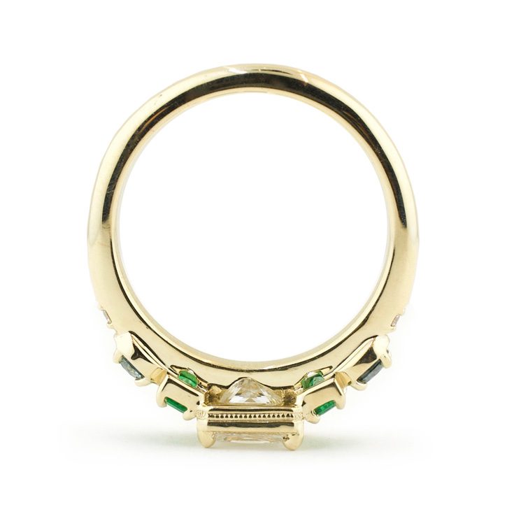 Having never worn a traditional engagement ring, our client wanted something with an engagement ring style. Keeping a diamond as a traditional center stone, we wanted to add some gemstones to honor her love of deep blues and greens. Two baguette emeralds sit on either side of the center stone, followed by round montana sapphires. Diamond melee on the end of the band ties the ring together. The princess cut diamond in the center of the ring makes this design full of playful shapes and colors. A 14k yellow gold band keeps the ring looking traditional and somewhat vintage.