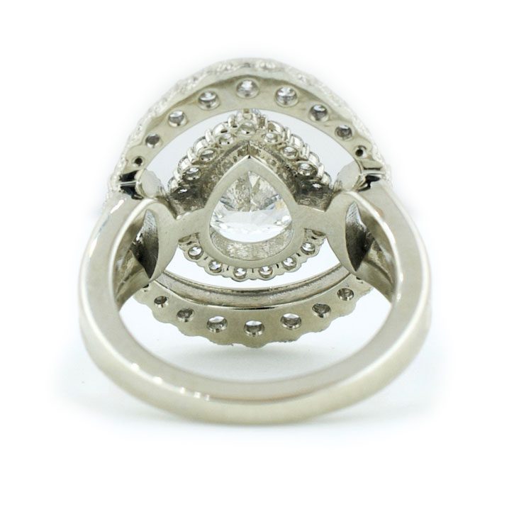 This diamond triple goddess ring was inspired by the triple goddess symbol, and our client’s appreciation of airy, nature-inspired designs. A 1 carat pear cut diamond center stone acts as the center moon of the symbol, with two crescent moons composed of diamond melee taking up the sides. A double halo of milgrain and diamonds surrounds the center pear diamond, creating extra sparkle and texture. We designed two additional moons extending north and south, surrounding the overall design with negative space, aiding in creating a light and airy feel. In profile, The Dina has hidden milgrain and crown detailing surrounding the entire base of the piece. A 14k white gold split shank band creates stability for the overall design.
