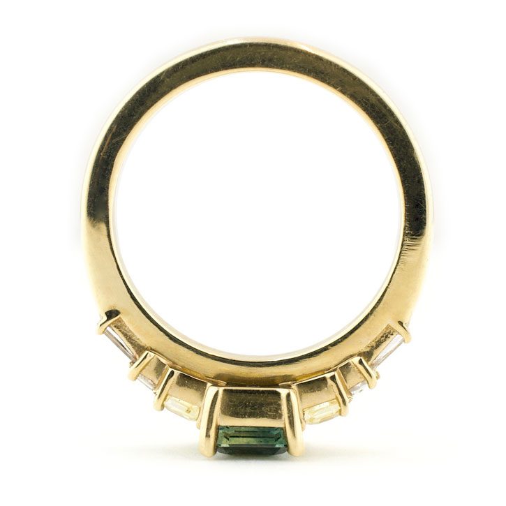 This custom emerald cut sapphire and diamond baguette engagement ring was designed for a client who met her fiancé on Sapphire Street. Accordingly, it was symbolic to include sapphire as the main stones in her engagement ring, dark blue for her center stone, and yellow sapphires because her favorite color is yellow. Wanting with an estate jewelry feel, we prong set baguette diamonds in descending order from the sapphire center stone, creating a silhouette with antique influences. All the stones in this piece are prong set in 14k yellow gold to allow the maximum amount of light to enter the stone, but also to provide structure and durability.