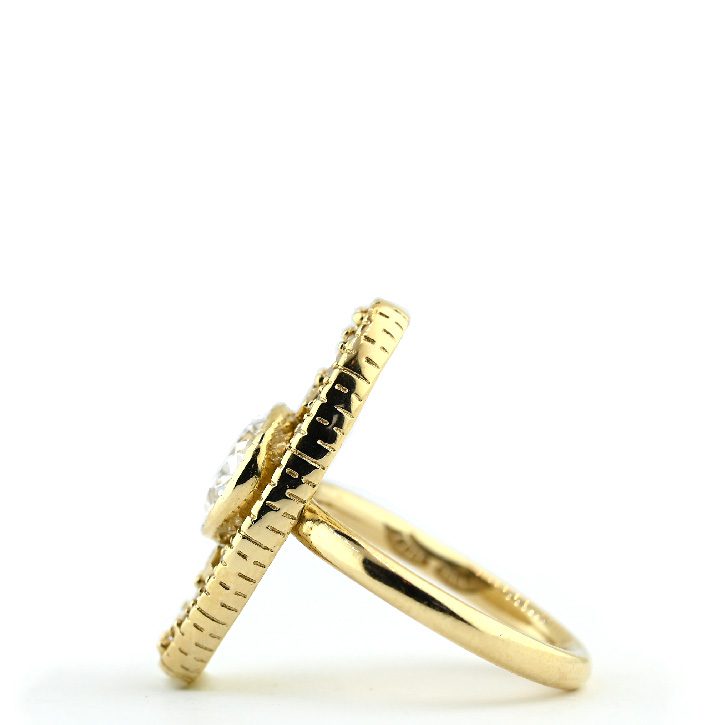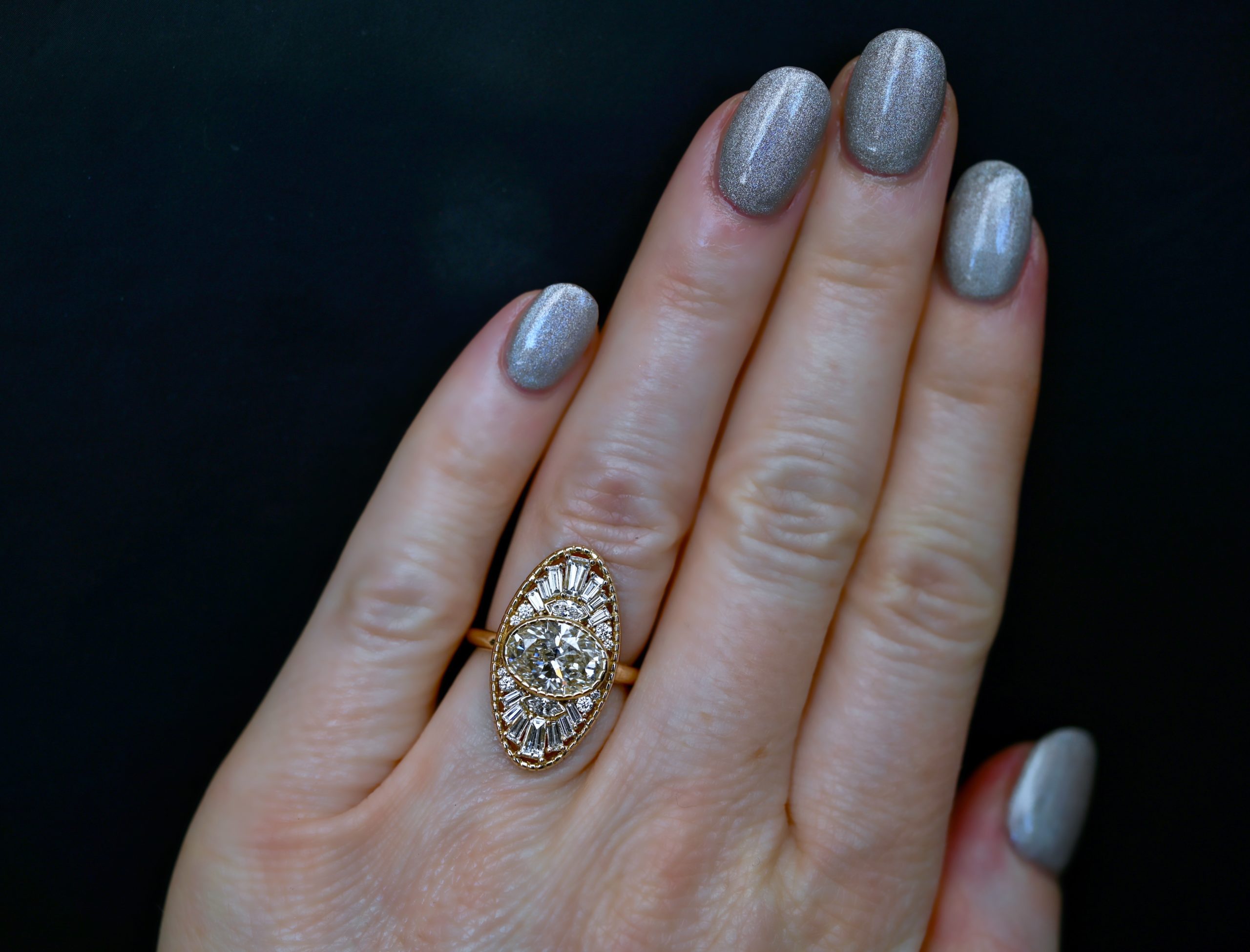 The Mad-Len antique-inspired vertical diamond ring combines many design elements into one new, modern engagement ring. A 2 carat oval cut lab grown diamond is set east-west in a bezel setting with subtle milgrain details. Surrounding the oval cut center stone is a baguette cut diamond starburst halo, inspired by art deco ballerina halos. Two additional marquise cut diamonds sit above and below the oval diamond center stone. The entire design is surrounded by a 14k yellow gold bezel with alternating rays carved into the sides.