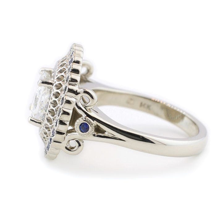 A sapphire filigree mandala ring, The Margaret custom victorian engagement ring was designed exclusively for Margaret and her love of blue sapphires. Knowing she wanted a floral-inspired engagement ring, Margaret wanted to create size in her ring using metal details. We designed her vintage filigree into a mandala pattern that extends from her princess cut diamond center stone, finishing in a stunning sapphire halo.