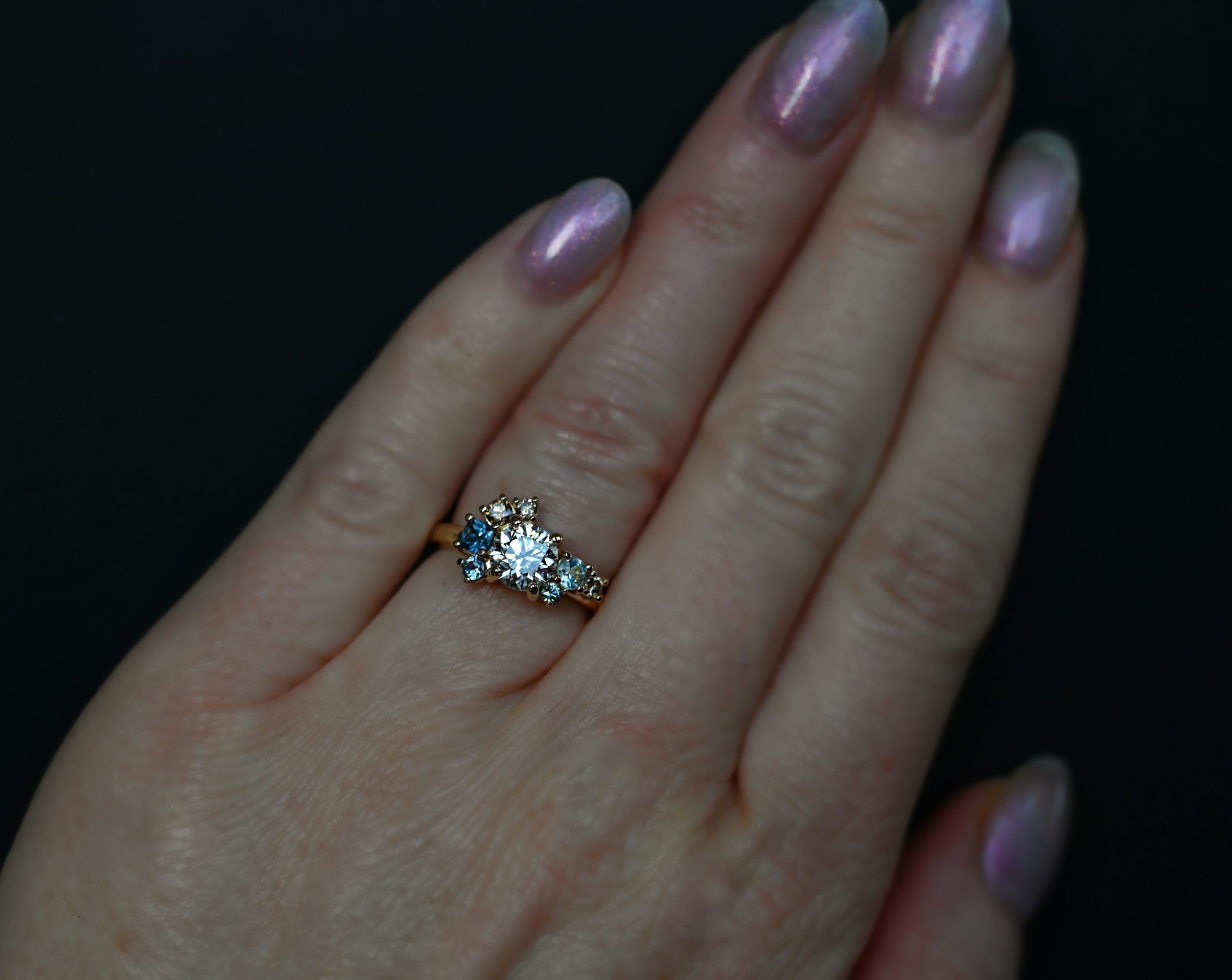The Nicole was designed for our client who wanted an engagement ring that felt like her. Her favorite type of designs are those that are simple, yet accomplish a completely unique look. Using a lab-grown diamond in a round cut as her center stone, we created this simple, yet unique asymmetric cluster of sapphires and diamonds in various hues to create a one-of-a-kind feel. A prong setting keeps the overall design very light and airy.