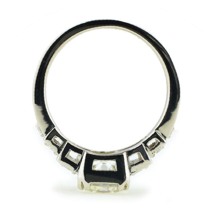 The 7 stone engagement ring is a sentimental piece that reuses diamonds from an heirloom ring in a fresh new design while paying homage to the original ring and owner it’s named for. The repurposed diamond center stone is prong set in 4 triangular double prongs for a geometric effect. Two large accent diamonds flank either side, each bead seat in a milgrain trapezoid; an Art Deco influenced detail. The profile view shows off a cathedral setting that captures light for maximum sparkle.
