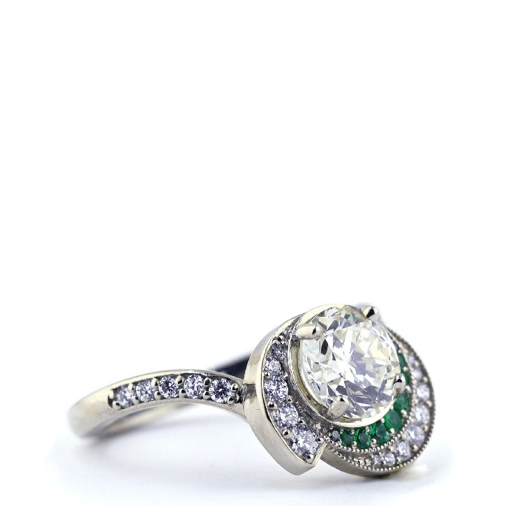 The Rachel spiral halo ring was designed using our client’s heirloom diamond as a center stone. Our client was really drawn to design with curved elements, so we created this unique asymmetric spiral halo. The outer halo on the left features round cut diamonds that taper in size as they swoop across the top. Mimicking the shape underneath is a row of emeralds, which add a vibrant pop of color. On the right, the halo follows the same tapering pattern, getting slightly larger and ending with a squared-off edge. The band features a slight chevron lift, adding more dynamism to the overall design.