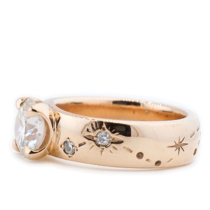 This moissanite constellation ring is a custom ethical engagement ring designed for an Abby Sparks Jewelry team member. Sarah wanted a super durable thick rose gold band with hand carved zodiac constellations and star details. The Pisces and Cancer star constellations are set in high polish rose gold surrounding the ethical moissanite center stone. Star details are created with flush set ethical Canadian diamonds for an organic, strewn-across-the-galaxy feel.