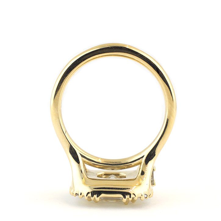 This Asscher cut art deco engagement ring was designed for our client to celebrate everything she has in this life and all the work she has done to get where she is, as well as represent her partner and three children. She loves the power in simplicity and is drawn to geometric and clean forms that create a powerful look. Her favorite architect is also Frank Lloyd Wright. Knowing these facts we referenced many art deco elements that follow the same clean and geometric design ideals. Using an Asscher cut moissanite as the center stone, we fit together geometric cuts – baguettes and tapered baguettes- mixed with round cut diamonds. 14k yellow gold keeps the entire look contemporary and fresh.