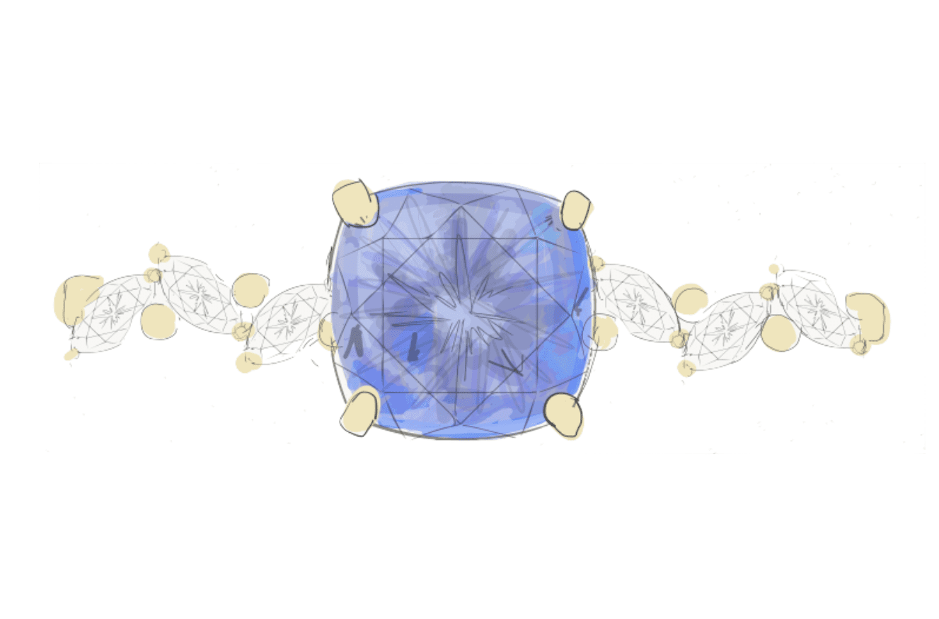The Taylor violet-blue tanzanite engagement ring was made using our client’s own heirloom tanzanite stone. The 3-carat gemstone was used as the focal point, with an organic and simple design using marquise-cut diamonds at alternating angles in the band. Small round beads of 14k yellow gold are set in between each marquise cut diamond, drawing your eye through the piece. The design is prong set to keep the overall look open and airy, allowing maximum light into the blue-purple tanzanite center stone.